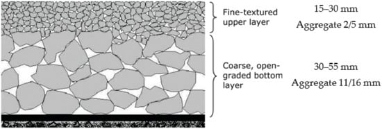 Twin layers were first developed in the Netherlands in the 1990s and were originally called twinlay because of the two porous layers with different gradations (Figure 10). This solution has been proven to have good performance in mitigating noise at the source and has some of the porous asphalt course’s similar pros and cons, like reducing splash and spray effects. Moreover, since it has two layers, the top one acts as a filter, hindering clogging and preventing that the bottom layer from eventual clogs [,,]. Studies have shown that the twin layer’s noise reduction capabilities can reach up to 6–7 dB(A) in reference to a standard Hot Mix Asphalt (HMA) [,,].