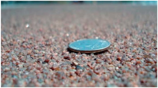 According to Woodward and Friel [], a High Friction Surfaces is a special type of road coating with very high skid resistance, mainly used in locations with a high risk of accidents (including pedestrians), and it has been used in the UK since the 1960s. It is a cold applied mixture of selected aggregates (high resistance to abrasion and polishing) mixed with a bond coat resin (epoxy, polyurethane, resin, or acrylic) (Figure 11). These proprietary solutions are commercially available, and typically, they have a higher economic impact and do not aim to mitigate road noise. Nevertheless, in specific design scenarios, such as intersections, it has been shown that, in optimal conditions, they can abate up to 5 dB(A) of noise [].