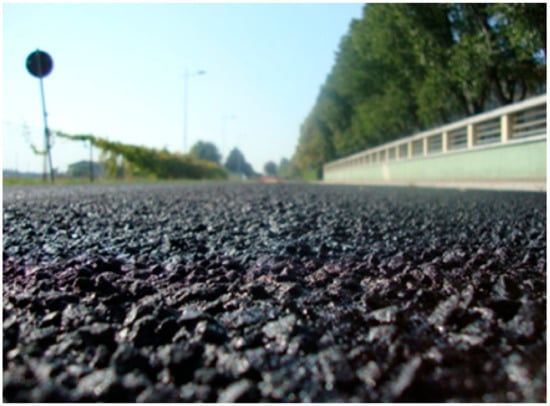 Microsurfacings are polymer-modified, binder emulsion-based, dense-graded, cold-mixed, and quick-setting asphalt surfacing materials. They are a widely used solution for pavement maintenance and increasing safety. They act as a protective wearing course that can be applied over the existing pavement, thus reducing some irregularities and filling cracks. They provide a surface with a regular and even texture, as shown in Figure 12. Microsurfacings are well known as a construction method with economic and environmental benefits [,,]. Apart from the proven positive effects in terms of skid resistance, recent studies were conducted to assess their performance in terms of noise reduction when a specific mix gradation and powdered rubber were used in combination [].