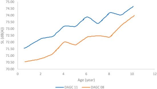 Noise evolution over time for a passenger car at 60 km/h for dense-graded asphalt concrete with 11 mm and 8 mm maximum aggregate sizes (adapted from []).