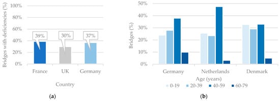 (a) Estimated percentage of highway bridges with deficiencies (adapted from [2]); (b): age of bridges in Germany, the Netherlands, and Denmark over the Trans-European Transport Network (TEN-T) (adapted from [3]).