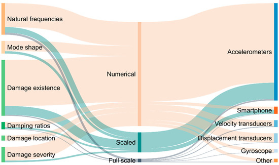 Figure 2 illustrates the connections between (1) the publication scope (structural modal identification or damage detection), (2) the publication type, and (3) the sensing units employed. The diagram is normalized with respect to the publication type (see, for example, the scale of the central bars). To simplify the figure, the 12 papers focusing on both numerical and experimental analyses are reported under both their respective categories (numerical and scaled or full-scale), i.e., they are reported twice in the diagram.