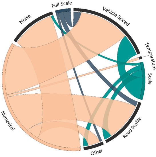 Regarding the sensitivity to VBI parameters (Figure 3), numerical studies cover the entire spectrum of sensitivity parameters. The same applies to the experimental scaled campaigns that address all the identified sensitivity parameters apart from the temperature effect. In fact, temperature variation is considered in only one (numerical) article. Full-scaled experimental studies focus on vehicle speed and road profile variability.