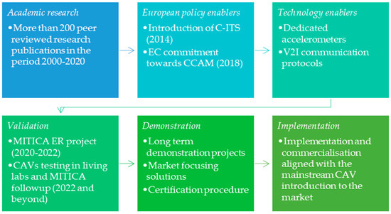 - Lu, M.; Castells, J.; Hofman, P.; Blokpoel, R.; Vallejo, A. Pan-European deployment of C-ITS: The way forward. In Proceedings of the 26th World Congress on Intelligent Transport Systems, Singapore, 21–25 October 2019. [Google Scholar]