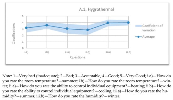 Analyzing the results presented in Figure 2, it is clear that the user’s perception that refers to the ability to control individual devices, heating and cooling, has the worst rating average (ii.a) = 3.0; ii.b) = 2.8), and a higher coefficient of variation (ii.a) CV = 38%; ii.b) CV = 38%), that reflects poor unanimity of the answers given by the users. The answers that obtained higher average results refer to humidity (iii.a) = 3.9; iii.b) = 4.0), especially in winter, for when there was a low coefficient of variation (iii.a) CV = 26%; iii.b) CV = 21%). The issue of humidity also obtained several answers stating doesn’t know/doesn’t apply. The fact that users answered this way is positive, because if there were humidity issues they would have assigned a rating. The question concerning comfort temperature—summer and winter—had satisfactory ratings (i.a) = 3.2 and i.b) = 3.6), although this factor may be non-representative because it is known that the building is composed of different rooms, exposed to different temperatures, which may reflect a combination of hot rooms and cold rooms. This should be noted in the item above (i.a) summer) that presented a coefficient of variation of 35%.