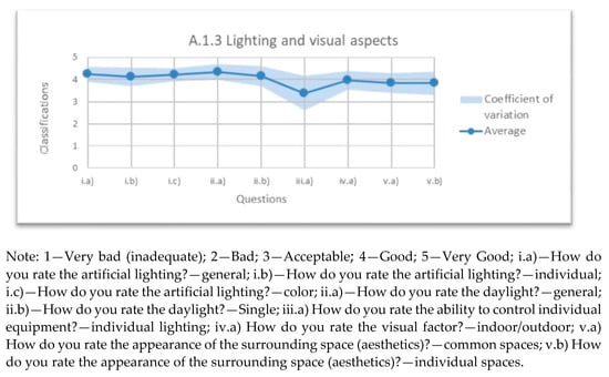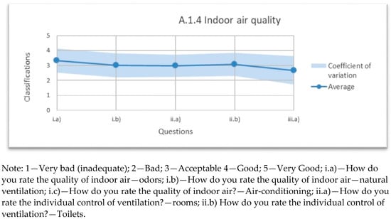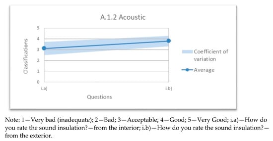 The results of acoustics (sound insulation rate from interior and exterior, respectively) on the i.a) inside and i.b) outside, can be observed in Figure 3. The average responses in i.a) received an acceptable classification of 3.1 (acceptable). However, there was some dispersion in the results (high coefficient of variation, i.a) CV = 1%), obtained from different classifications, which may correspond to a deficiency in sound insulation in some rooms, a fact explained by the type of spatial organization that the layout offers. The i.b) outside acoustics show an approximate average result of 4 (good). These results showed that in user perception the building has better acoustics from outside than inside.
