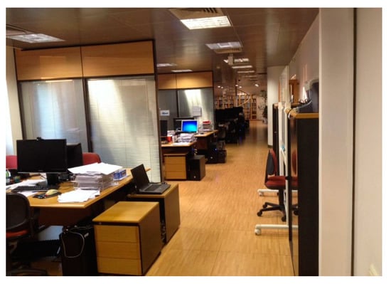 After completing the surveys with the users of the building, study of the specific aspects of the surveys was needed to understand certain physical characteristics of the building and the routines of the building users. With this purpose, photographs of the office were taken, a general layout of the space was designed, and a set of questions was prepared to be answered by one of the building users (space organization—open space, floor material, ventilation system, among others), to improve the understanding of some survey results.