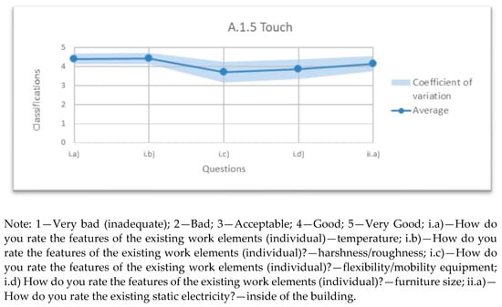 Furthermore, the COVID-19 pandemic redefined the concept of using buildings, making the inclusion of human health crucial [] and changing user perceptions of workplace hygiene. Thus, this criterion should be developed in future research. Table 1 also shows that the criterion with the least favorable results is the indoor air quality ( = 2.99 bad–acceptable). This is also an important criterion for users, and should be taken into account as a factor in indoor environmental quality (IEQ) evaluation [,] and in the decision-making process for interventions during the service life of the building.