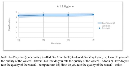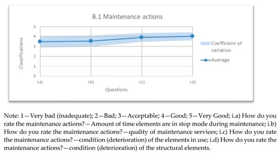 According to Figure 12, the rating for the first question is lower when compared to the other results. The number of time elements in stop mode during maintenance, ( = 3.5) can be characterized by a higher coefficient of variation and lower average ratings. However, these results seem to be acceptable. The last two paragraphs have more satisfactory ratings (i.c) condition (degradation) of the elements in use = 3.9, i.d), condition (degradation) of the structural elements = 4.0), are considered to be good results.