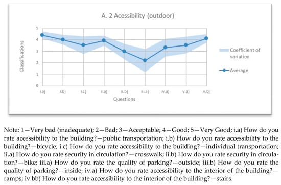 In Figure 9, some variation in the ratings was obtained. The answer that received the worst classification was iii.a) quality of outdoor parking ( = 2.2, bad), where user dissatisfaction was evident. It should be noted that the questions that refer to access by i.c) individual transport (CV = 39%), the quality of iii.a) outdoor parking (CV = 50%) and iii.b) indoor parking (CV = 38%), and the accessibility to the interior of the building via iv.a) ramps (CV = 37%), were associated with a considerable coefficient of variation, and the parking outside obtained the highest response to any question asked.