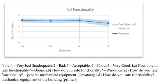 The functionality of the building elements obtained satisfactory responses; the ratings were very close, as can be seen in Figure 11. Only the last question, which refers to the i.d) mechanical equipment of the building (printers) ( = 3.5), obtained a lower average rating, but this is nonetheless acceptable.