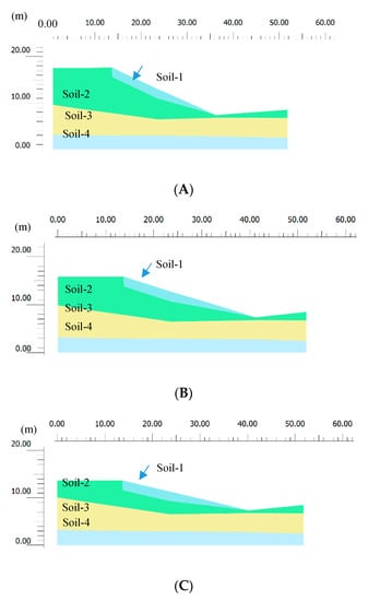 Three geometries of the slope with three different slope ratios of 2H:1V, 3H:1V, and 4H:1V were generated similar to the highway slope in consideration. The geometry of the slopes as shown in Figure 2, was further utilized in FEM analysis. Based on the stability analysis, the FS of the 2H:1V, 3H:1V, and 4H:1V slopes were 1.093, 1.277, and 1.62, respectively, before RPP installation. The slip surface for each of the slopes (at the dry condition and PWC) is presented in Figure 3.