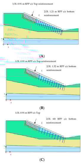 The top part of each slope ratio is reinforced with 0.91 m RPP spacing to provide additional resistance against deformation, while the rest of the slope is treated with a higher spacing of RPP. The RPP is modeled as the plate element. The properties of RPP are also summarized in Table 3. A total of six different RPP spacings were considered for each slope ratio, Khan et al. [], which was designated as configurations A, B, C, D, E, and F. RPP configurations A, B, and C were modeled with uniform RPP spacing of 0.91, 1.21, and 1.52 m, respectively. Varied RPP spacings were utilized in configurations D, E, and F, where at the top part RPPs are kept at constant spacings of 0.91, and 1.21, 1.52, and 1.83 m. RPP spacing is considered at the bottom part of each slope. The details of the study are summarized in Table 2 and Figure 4.