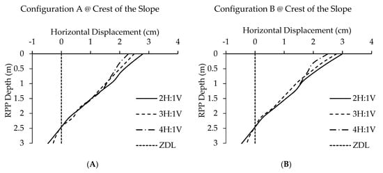Horizontal displacement profile of RPPs at the crest of the highway slopes: (A) configuration A, (B) configuration B, (C) configuration C, (D) configuration D, (E) configuration E, and (F) configuration F (Zero Displacement Line (ZDL)).