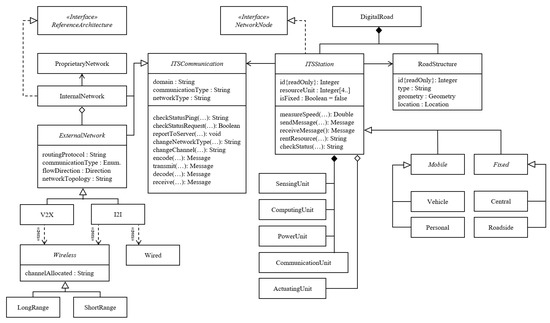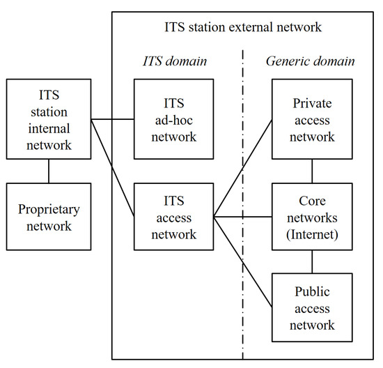 - ETSI; Intelligent Transport Systems (ITS); Communications Architecture. Standard ETSI EN 302 665 (V1.1.1); European Telecommunications Standards Institute: Sophia Antipolis, France, 2010. [Google Scholar]