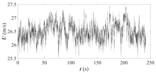 Figure 3 shows an example of the acquired wind tunnel velocity and its random trend. In total, four sets of wind tunnel velocities are discussed here. The mean values of the wind tunnel velocities, , were 8.33, 14.76, 21.05, and 26.52 m/s, for the angle of attack equal to −10°.