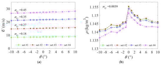 The different variability calculated for each angle of attack in terms of mean and standard deviation suggests an uncertainty that should be considered by comparing pressure coefficients between different angles of attack. Figure 4a illustrates the trends shown in Table 2 and provides the standard deviation of the mean velocity considering all angles of attack, . It was observed that the standard deviation increases linearly as a function of the mean velocity and ranges from 0.18 to 0.45 m/s.