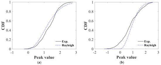Another important aspect is the Gaussianity of the wind tunnel velocity random process. The assumption that the mean value is representative of the wind tunnel velocity time history is valid only if the wind velocity random process is Gaussian. The empirical cumulative density function of the absolute peaks of the wind velocity time histories was computed and fitted using a Rayleigh distribution. If the Rayleigh distribution fits the absolute peaks, the process can be assumed to be Gaussian [35]. The one-sample Kolmogorov–Smirnov (K-S) test [7,36] at the 95% level of confidence was used to estimate the goodness of the fit. The test result h is 1 if the test rejects the null hypothesis at the 5% significance level, or 0 otherwise. Figure 5 shows two examples of the empirical Cumulative Density Function (CDF) of the normalized and standardized wind velocity local peaks fitted by the Raileigh distribution. Although the fit appears to be better in some cases (Figure 5a) than others (Figure 5b), the K-S test rejects the null hypothesis at the 5% significance level [36]. This is the same reduction in the percentage of the level of confidence.