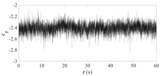 A typical time history of the pressure coefficient, , is illustrated in Figure 6. This is a random process and is generally non-Gaussian in the detachment zones [7]. The pressure coefficient is obtained according to Equation (1) and depends on a non-dimensionalization with respect to the kinetic pressure . The uncertainty related to the kinetic pressure in terms of four different aspects—namely, wind velocity variability between different angles of attack, wind velocity random process non-stationarity, wind velocity random process non-Gaussianity, and air density variability—affects the pressure coefficient estimation.