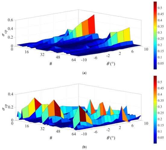 The mean pressure coefficient was estimated through the non-dimensionalization using the mean wind velocity sets listed in Table 2 and by the air density given in Figure 5, for all angles of attack and both section models. In total, four pressure coefficient values were calculated for all pressure taps and the standard deviation of these four values, , was assumed as a measure of the mean pressure coefficient variability due to the non-dimensionalization. The standard deviation is plotted in Figure 7 versus the angle of attack and for all pressure taps, for Mod01 (Figure 7a) and Mod02 (Figure 7b). It was observed that the aerodynamics of the section model and the angle of attack closely affect the .