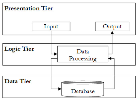 The presentation tier, as shown in Figure 2, which is the uppermost layer of the application, interconnects with the other two tiers of the application. It shows the data of the administered output content and the layer that users access through the graphical user interface (GUI). The logic tier (application tier, middle tier, or business logic) receives input from the presentation tier. It processes and controls the functionalities of the proposed application. On the other hand, the data storage tier is the data access layer that encapsulates the persistence mechanisms and exposes the data to the application tier. The storage mechanism allows for updates or changes without affecting the application tier clients.