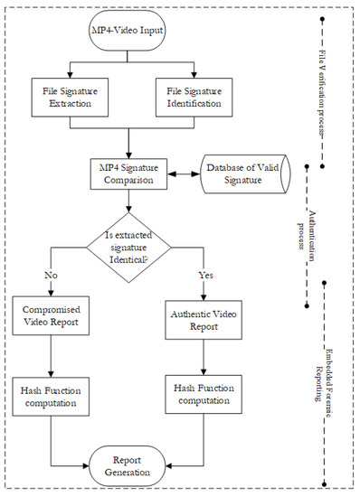 One core component of an automated forensics process, as highlighted in Figure 1, is the capability to ensure white-box testing. The combination of the tiered architecture and the process presented in Figure 3 was conceived of to address this focus. This further ensures that the software information domain and its component functions are fully understood, as are its behaviour, performance, and the interfaces required. An imputed Mp4 Video file is parsed for file signature identification and extraction. The extraction signature is then compared with a known signature. The report of this verification process is further hashed to ensure integrity verification. These are further explained in the following subsections.
