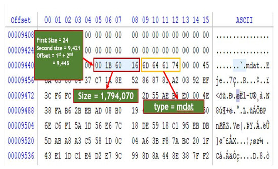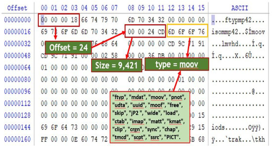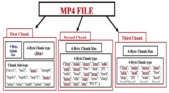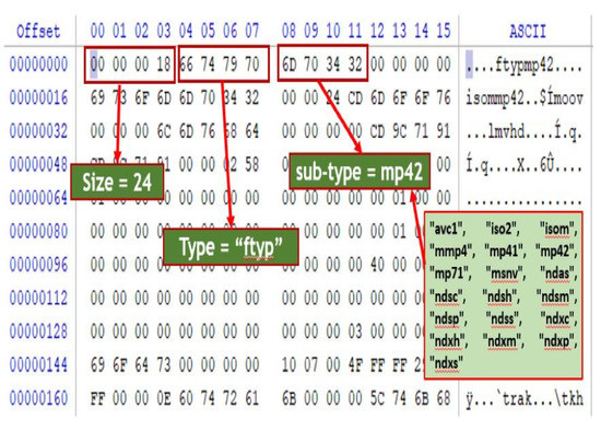 The MP4 video format (MPEG-4 Section 14, also known as MPEG-4 AVC, where AVC denotes Advanced Video Coding and MPEG refers to Motion Picture Expert Group) is one of the most common digital multimedia formats for storing video and audio. However, it can also be used to store other data such as subtitles and still images. The official file name extension for MPEG-4 Part 14 files is “.mp4”, other extensions, most commonly “.m4a” and “.m4p”, notwithstanding. MP4 is based on the ISO/IEC 14496-12:2004 standard, which in turn is based on the QuickTime file format. Its structure is similar to the QuickTime file format, with some additional features. An MP4 file has three sections: header (ftyp), video data (mdat), index information (moov), as shown in Figure 4. Furthermore, the MP4 format also consists of consecutive chunks. Each chunk of MP4 files includes an 8 byte header, a 4 byte chunk size (high byte first, big-endian), and a 4 byte chunk type. The hexadecimal composition of these chunks is further depicted in Figure 5. The first chunk of an MP4 file has a four byte chunk size at offset zero and a four byte chunk type.