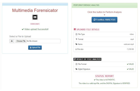 The user (forensic investigator) starts by choosing the type of multimedia file (in this case video) to be investigated. After a successful upload of the multimedia file, the user then performs the analysis by “pushing” the “Forensic Analysis” “button” shown in Figure 8. The result of the verification/authentication process is then displayed. The interpretation of the result is presented in Table 5.