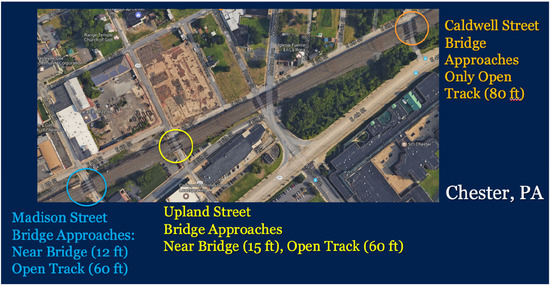 Historical track geometry data were obtained from Amtrak spanning a 60-month period from January 2005 to January 2010. In June of 2012, ground penetrating radar (GPR) scanning along the track was conducted to identify substructure features. The analyses of track geometry data and GPR data led to identifying the three worst bridge approach locations in terms of recurring differential movements. These are the open-deck bridges over Upland, Madison, and Caldwell Streets. These three locations with frequent maintenance needs were then selected in a US DOT Federal Railroad Administration supported project for field instrumentation, as shown in Figure 1 [27,28,29,30,31].
