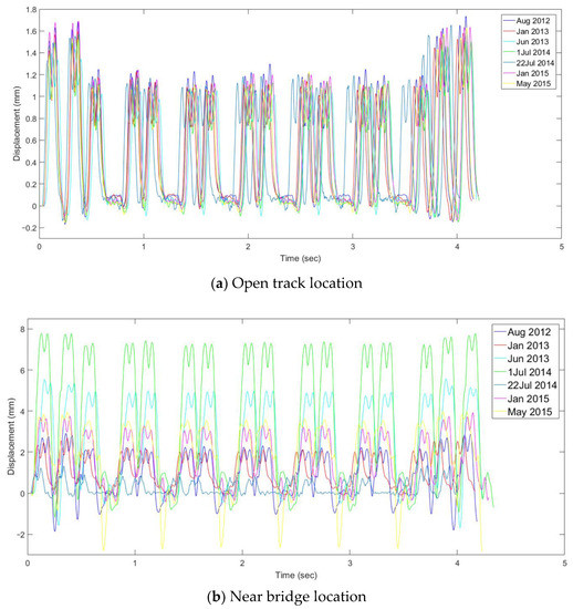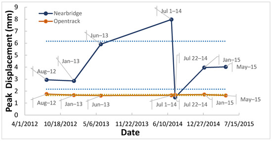 It is important to note that unlike the open track data, the near bridge data showed great variability in magnitudes of transient deformations collected over time. The maximum vertical deformation continued to increase from August 2012 (2.5 mm) to 1 July 2014 (8 mm). Next, the maximum vertical deformation suddenly decreased to 1.6 mm on 22 July 2014, then up to 4 mm in May 2015. This sudden decrease in deformation was due to tamping maintenance activity conducted at the Upland Street location. In addition, a clear trend of increasing dynamic response was observed with time at the near bridge location. From visual inspection, it is noticeable that open track and near bridge locations have significantly different response trends under train passage.