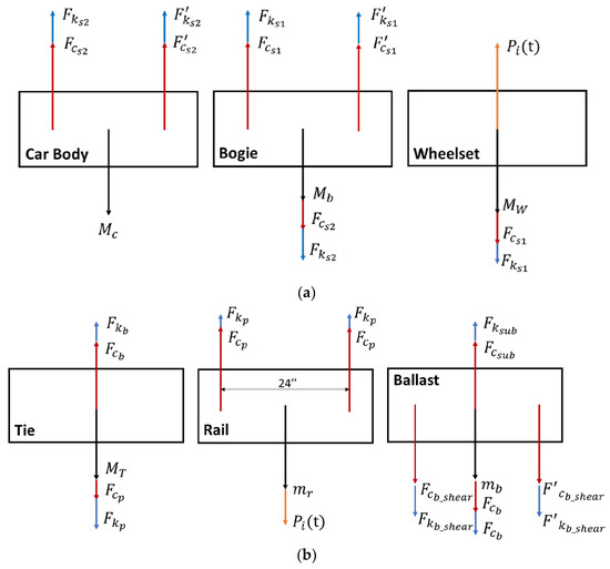 Only vertical transient displacement and pitch motion are considered for the vehicle. The body diagrams of dynamic force equilibrium for vehicle components are illustrated in Figure 7a. For example, the car body supported by two bogies reaches dynamic equilibrium with the external forces from bogies and self-weight. Similarly, each bogie is connected to the car body and two-wheel sets. The force equilibrium for the bogie is an equilibrium between self-weight of bogie, and contact forces between bogies and wheelsets, and contact forces between car body and bogie. Each wheel set has self-weight and two external forces, including contact force between wheelset and rail and contact force between wheelset and bogie. All the forces exerted on wheelset should reach equilibrium at any given time. Additionally, the equilibrium force, the equilibrium of moments for the bogie should also be achieved at the same time.