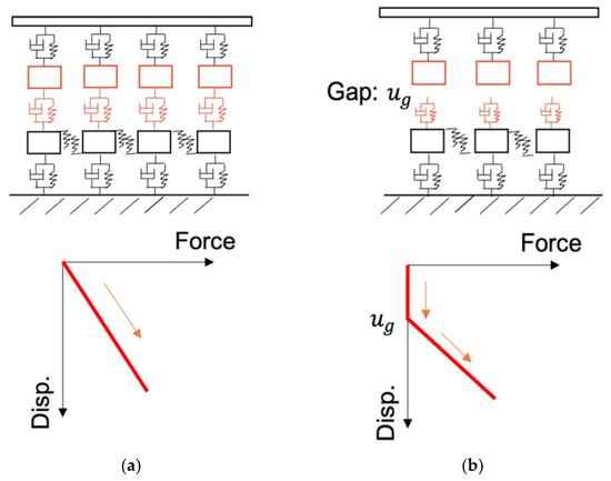 Hanging crossties exist very often at track near bridge locations. These hanging crossties commonly lack adequate support from the ballast layer underneath it. Figure 8 presents schematics showing the model structure with and without gaps, as well as the corresponding force-displacement relations. For these inadequately supported crossties, the force-displacement relationship cannot be assumed to be linear elastic anymore. Instead, it becomes nonlinear due to the gap between the tie and ballast. For simplicity, the proposed nonlinear train-track-bridge model assumes bi-linear force-displacement relationship. More specifically, it is assumed that at the beginning of loading, there is no force between the crosstie and ballast until the gap () is closed. Once the distance between the crosstie and ballast reaches the magnitude of gap, the stiffness of springs between the crosstie and ballast becomes linear (). Note that the tangent of stiffness from open track and near bridge locations might be different, i.e., . It is assumed that damping coefficient, , at near bridge is constant in the analysis. Figure 8 illustrates the force-displacement relationship at (a) open track location with linear stiffness and (b) near bridge location with nonlinear stiffness. The gap between crosstie and ballast is represented by . Note that in the model, the locations of the gap will not affect the results since it is discretely supported. The amount of gap underneath each crosstie can also be assigned arbitrarily based on realistic situations.