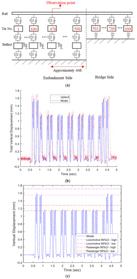 With the ACELA Express passenger train moving from embankment side to bridge side in the model, the structural responses including transient deformation, reaction force, velocity, and acceleration can be obtained from the model. Field collected data are then used to validate the transient deformations obtained from the numerical model. Figure 9b,c show the comparisons between model predictions and field data. Figure 9b clearly shows that the results from the proposed model match well with the field data collected in January 2015. The model simulation results demonstrate 32 peaks, which correspond to 8 cars with one passage of ACELA passenger train. The front and rear of the train register higher displacements due to heavier weights of the locomotives. Figure 9c compares the confidence intervals of field data and model predictions. The maximum peak displacement predicted by the model falls into the 95% confidence interval calculated from the maximum peak displacement value from the field data collected between August 2012 and May 2015.