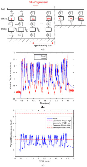 Figure 10c compares the confidence intervals of field data collected in January 2013 and model results. The upper and lower boundaries of 95% confidence intervals are graphed for locomotive passage and passenger car passage, respectively. Due to the increase in the gap amount with time, the peak displacement may vary significantly. Therefore, the higher and lower boundaries of the confidence intervals are relatively far away from each other compared with the open track scenario. It is noticed that the maximum peak displacement value from the model still falls into the 95% confidence interval calculated from the maximum peak displacement value from the field data collected between August 2012 and May 2015.