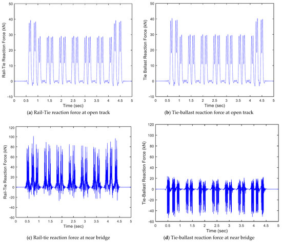 In addition to the rail-tie reaction force, tie-ballast reaction force also exhibits quite different behavior as compared to the open track location. At the open track location, the rail-tie reaction and tie-ballast reaction forces are comparable in both trends and magnitude. However, at the near bridge location, it is noticed that the tie-ballast reaction force is considerably smaller than rail-tie reaction force (see Figure 11c,d). Such difference in rail-tie reaction force value and tie-ballast reaction force is the total external force on crosstie, causing possibly larger vibration accelerations.