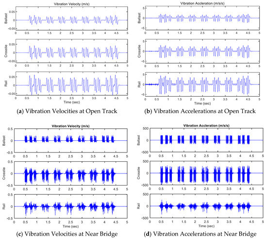 The structural vibration velocities and accelerations can also be predicted from the model simulations. Figure 12a shows the time history of vibration velocities of ballast mass, crosstie and rail, respectively. The peaks represent each wheelset of the ACELA Express passenger train. It is noticed that the vibration velocities of different components in the system have similar magnitude of 10−2 m/s. Furthermore, ballast mass registers the lowest vibration velocity in the system of 0.027 m/s; crosstie mass shows slightly higher velocity of 0.039 m/s; and rail mass implies the highest velocity of 0.058 m/s. Similarly, the time history of vibration accelerations of the track system is graphed in Figure 12b. The vibration accelerations of different components are all below one standard gravitational acceleration, g = 9.8 . The peak accelerations at the open track location are approximately 2 for ballast mass; 3 for crosstie, and 4.5 for rail mass.