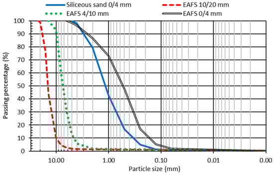 The gradation of all the EAFS fractions is shown in Figure 1, in which its low fines content (<0.063 mm) can be distinguished. This is a common problem of EAFS and it reduces the concrete workability [].