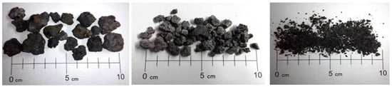 The EAFS is produced during the melting of scrap in electric arc furnaces to obtain steel []. After solidification, it is a brownish-black granular material, with a very high density, around 3.5 Mg/m3, high micro-porosity, an angular shape, and excellent wear resistance []. It is especially suitable for wearing courses where skid resistance and durability are critical functional requirements [] and for the production of asphalt mixes subjected to heavy traffic [].
