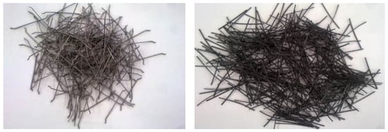 Subsequently, two other mixes were prepared, one with each type of fibers: metallic or synthetic. The use of fibers is common in concrete pavements to reduce cracking []. The amount of fiber, 0.5% of the total concrete mix volume, was also defined through preliminary mixes in which it was determined that the fibers would not greatly reduce the workability of concrete that is already highly conditioned by the use of large quantities of EAFS. In addition, it was not desirable to increase the w/c ratio in order not to reduce the strength of the concrete.