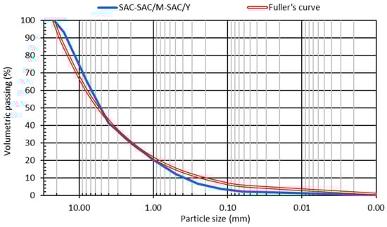 First, a mix without fibers was designed, in which the EAFS content was maximized, but at the same time an adequate workability for concrete for rigid pavements (S2 or S3 slump class according to EN 206 []) was established as the main objective. Through various preliminary mixes, a water-to-cement (w/c) ratio of 0.55 was defined, which allowed us to obtain an adequate balance between workability and strength. In addition, the optimum EAFS content was determined as 78% of the total mass of aggregate added. The remaining 22% of aggregate was siliceous sand 0/4 mm. Due to the different density of the aggregates, EAFS and siliceous sand represented 73% and 27% of the total aggregate volume, respectively. The rounded shape of the sand partially compensated for the higher surface roughness and the higher density of EAFS. The total aggregate content of the mixes was defined by fitting to the Fuller curve, as shown in Figure 4.