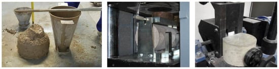 The fresh behavior of the mixes was evaluated by determining their consistency (Abrams-cone test, EN 12350-2 [], see Figure 5 left) and their fresh density (EN 12350-6 []). The results of each test are shown in Table 5.
