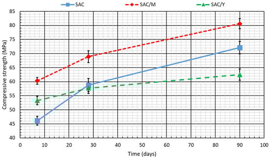 The compressive strength was measured at 7, 28, and 90 days on 15 × 30 cm cylindrical specimens that were stored in a wet chamber until the testing time. The evolution of this strength over time is shown in Figure 6. It can be noted that the strength of all the mixes was higher than 45 MPa, regardless of the age, showing all the mixes had an optimum compressive-strength development [].