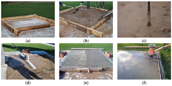 Construction process of the slabs: (a) construction of the formwork; (b) concrete casting; (c) concrete vibration with a needle vibrator; (d) surface smoothing with a vibrating screed; (e) slabs finished without surface treatment; (f) mechanical scrubbing of surface slabs.