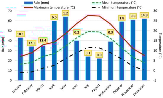 Burgos is one of the cities in Spain with a more adverse climatology due to its location in the north of the country and its high altitude (856 m). Although it has a relatively dry climate, it has large thermal oscillations between night and day, which result in frosts, and between the different seasons. This means that an outdoor exposure test performed in this location is extremely demanding for any type of material that will be directly exposed to the elements (sun, water, ice…) during its service life []. The main characteristics of the climatology of Burgos are shown in Figure 8.