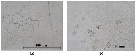 Surface-treatment defects: (a) cracks (SAC-mix slab); (b) chips (SAC/Y-mix slab) (adapted from []).