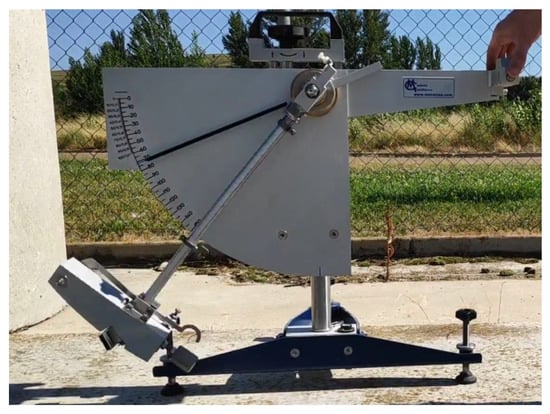 This property was measured using the friction pendulum, also known as the TRRL (Transport Road Research Laboratory) pendulum, according to EN 13036-4 [], which is shown in Figure 10. The test was performed in two different surface conditions (wet and dry surface) and at three different points on each slab for each surface condition (wet or dry). The result of this test is the so-called “British Pendulum Number” (BPN).