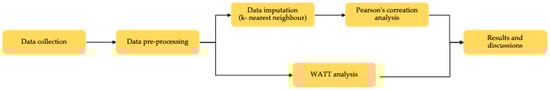 The kNN algorithm is used to replace missing values in the data sets. The concept of kNN is to substitute missing values with the most similar complete values. The k value can vary depending on the amount of complete data in the data sets. For example, when k is selected as 3 (k = 3), the three nearest data points are calculated using the selected functions (i.e., Euclidean, Manhattan, Pearson) to create and insert a new value for the missing one. However, the selection of the k value must be carefully considered because inappropriate selection can result in poor model performance in terms of estimation. A lower k-value may indicate the lack of conformity to the trend in the data set, whereas a higher k value may be included with other disturbance values []. The best solution for finding a k value is to test different k values in the data sets to reduce arbitrary error []. This study uses the standard Euclidian distance form, as shown in Equation (1).