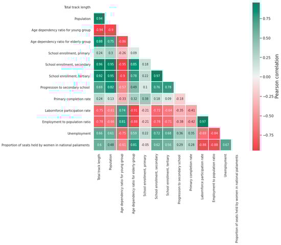 From the Pearson’s correlation analysis among 12 social factors and the growth of the Shinkansen network, the outcomes represent values between −1 and 1, as described in Table 1 and Figure 2.