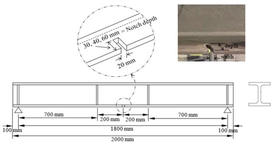A total of twelve bare I-shaped steel beams of W 203 × 203 × 46.1 sections were prepared, instrumented, and experimentally tested to examine their flexural performance. One of the specimens, control beam, was kept undamaged while the other eleven specimens were pre-damaged by cutting a U-shaped notch in their tension (bottom) flange and were left unrepaired. The American Institute of Steel Construction manual (AISC) was utilized in this work to design the control beam. Accordingly, the span and section of the laterally unsupported control beam were selected to ensure that it would not undergo lateral torsional buckling. The AISC manual provides design recommendations for tension members with bolted connections where the bolt holes can be considered as a damage to the member. Additionally, the AISC manual covers the design of beams with web openings and beams with missing flange. All twelve laterally unsupported I-shaped specimens were tested in two-point loadings for flexure and the parameters considered in the study were the location and the size of the notches. The notch size (depth) considered in this study was 30 mm, 40 mm, and 60 mm in depth, while the notch opening width was kept constant at 20 mm in all the damaged specimens, as shown Figure 1. All beams had a total length of 2000 mm and an actual span of 1800 mm between supports, as shown in Figure 1. The location of the notch selected in this study was at one-quarter, one-third, and the middle of the specimen clear span. All pre-damaged steel specimens had notches on one side of the tension flange with respect to the beam web except for two specimens where two notches were cut at the middle of the specimen clear span on both sides of the tension flange and had two different depths, 40 mm and 60 mm.