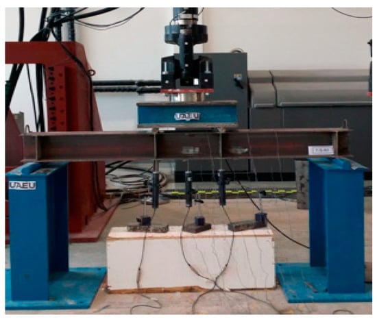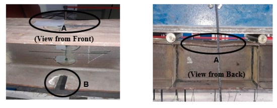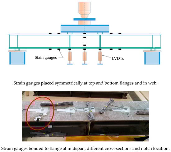 All tested beam specimens were prepared and instrumented with linear variable differential transformers (LVDTs) and strain gauges for deflection and strain readings. The strain gauges were attached to the external surface of bottom and top flanges and the web of the specimens at different locations, as displayed in Figure 3. The LVDTs were placed under the bottom flange at the loading point locations and at the middle section of the specimen, as shown in Figure 3.